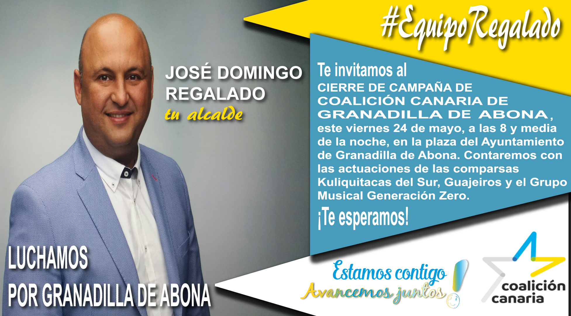Este viernes 24 de mayo, a las ocho y media de la noche, en la plaza del Ayuntamiento de Granadilla de Abona, celebraremos el CIERRE DE CAMPAÑA DE COALICIÓN CANARIA DE GRANADILLA DE ABONA. Te invitamos a que nos acompañes en el último acto de esta campaña en la que contaremos con las actuaciones de las comparsas Kuliquitacas del Sur, Guajeiros y el Grupo Musical Generación Zero. ¡Te esperamos!