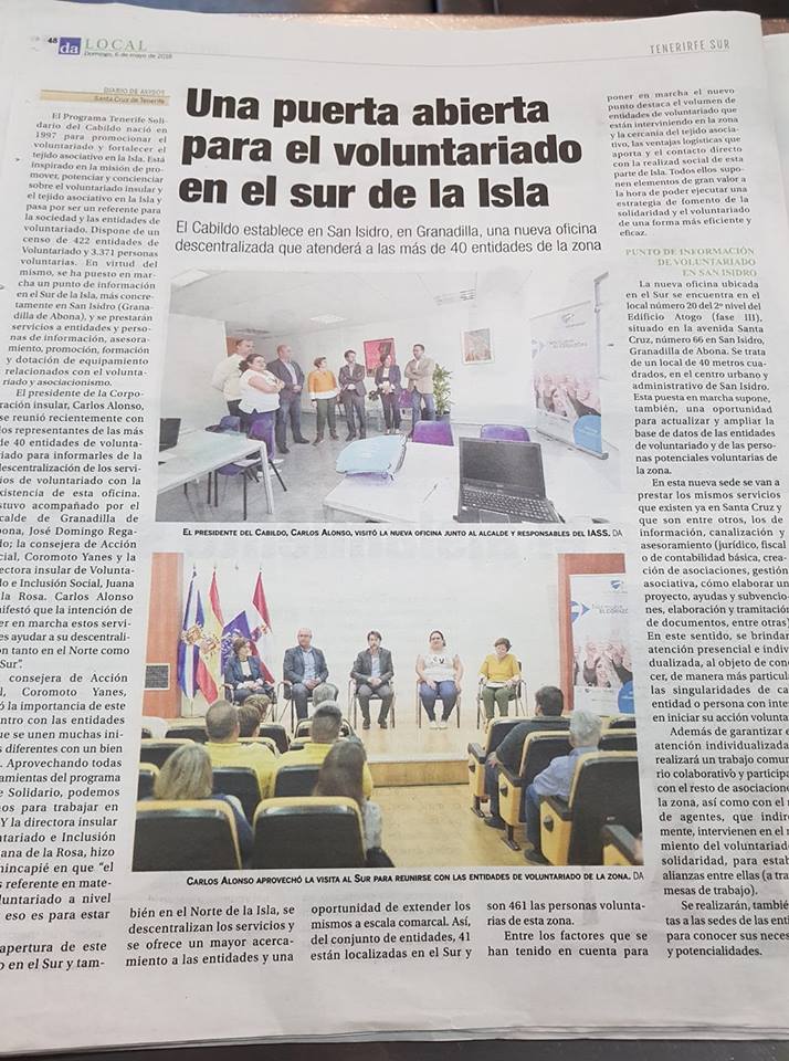 Nuestro alcalde, José Domingo Regalado, calificó de "buena noticia" la puesta en marcha de este nuevo punto gracias a la "solidaridad" con la que trabaja el Cabildo. "Va a ser un lugar de referencia, que estará abierto todos los martes y jueves, desde las 10.00 hasta las 13.00 horas, con asesoramiento jurídico, formación e información. Estamos contentos con ello y animamos a todos a que lo utilicen", subrayó.