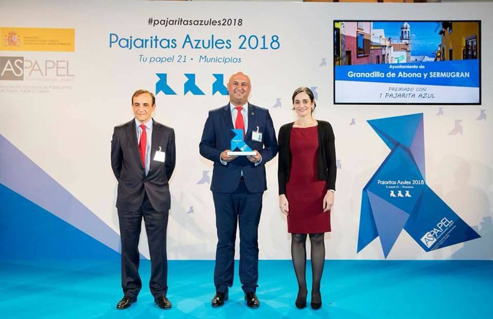 De manos de la Ministra y la Secretaria de Estado de Medio Ambiente, nuestro alcalde José Domingo Regalado en nombre del Ayuntamiento de Granadilla de Abona y la empresa pública Sermugran, ha recibido una #PajaritaAzul por la excelencia en la gestión de la recogida de papel y cartón. En tan sólo un año de gestión en esta materia, Granadilla de Abona es el único municipio de Canarias que recibe este galardón. Muchas gracias a tod@s las vecinas y vecinos y a los trabajadores de Sermugran por ir en una misma dirección y ser referentes en cuestión de reciclaje. Este es un premio de todos los granadiller@s. ¡Enhorabuena!
