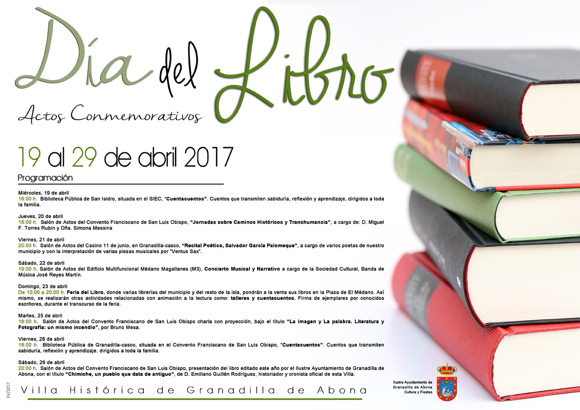 La Concejalía de Cultura del Ayuntamiento de Granadilla de Abona ha organizado un variado programa de actos que se inicia el miércoles 19 y concluye el domingo 29 de abril, y que contempla cuentacuentos, jornadas, recitales, charlas, presentaciones y conciertos. #GranadilladeAbonaAvanza