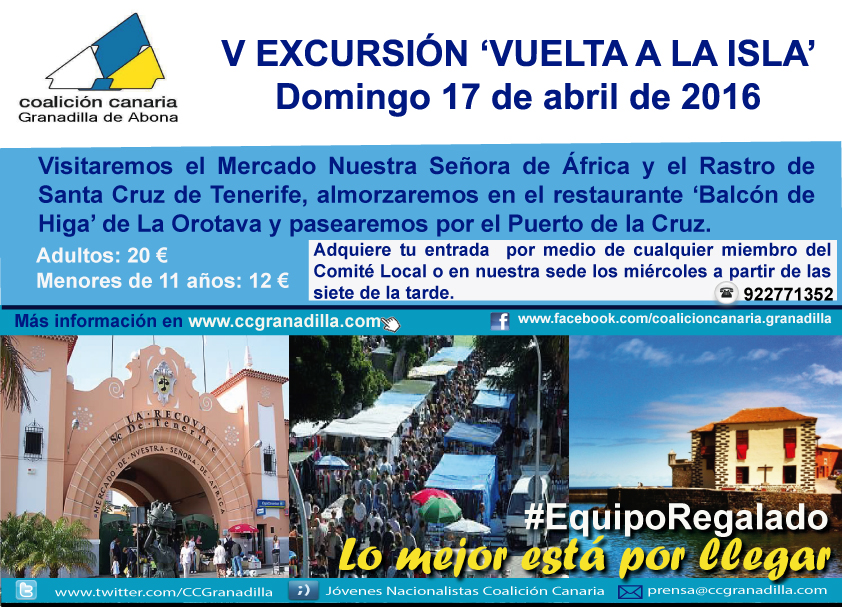 El Comité Local de Coalición Canaria de Granadilla de Abona, organiza una nueva jornada de convivencia para todos los afiliados, simpatizantes y vecinos y vecinas que deseen disfrutar de un domingo diferente el próximo 17 de abril de 2016. Por quinto año consecutivo los nacionalistas preparan una 'Vuelta a la Isla', donde se visitará el Mercado Nuestra Señora de África y el Rastro de Santa Cruz de Tenerife y el Puerto de la Cruz. El almuerzo se celebrará en el restaurante 'Balcón de Higa', de La Orotava. Si deseas participar adquiere tu entrada al precio de 20 euros para adultos y 12 euros para niños menores de 11 años contactando con cualquier miembro del Comité Local de Coalición Canaria de Granadilla de Abona ¡Te esperamos!