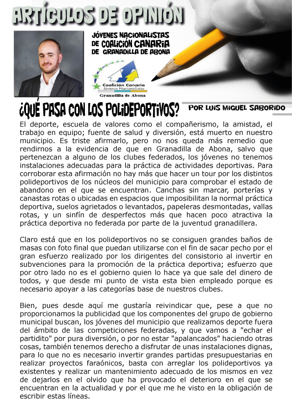 Los jóvenes Nacionalistas de Coalición Canaria de Granadilla de Abona, publican un nuevo artículo de opinión. En esta ocasión el compañero Luis Miguel Saborido, reflexiona sobre el estado actual de las instalaciones deportivas municipales.