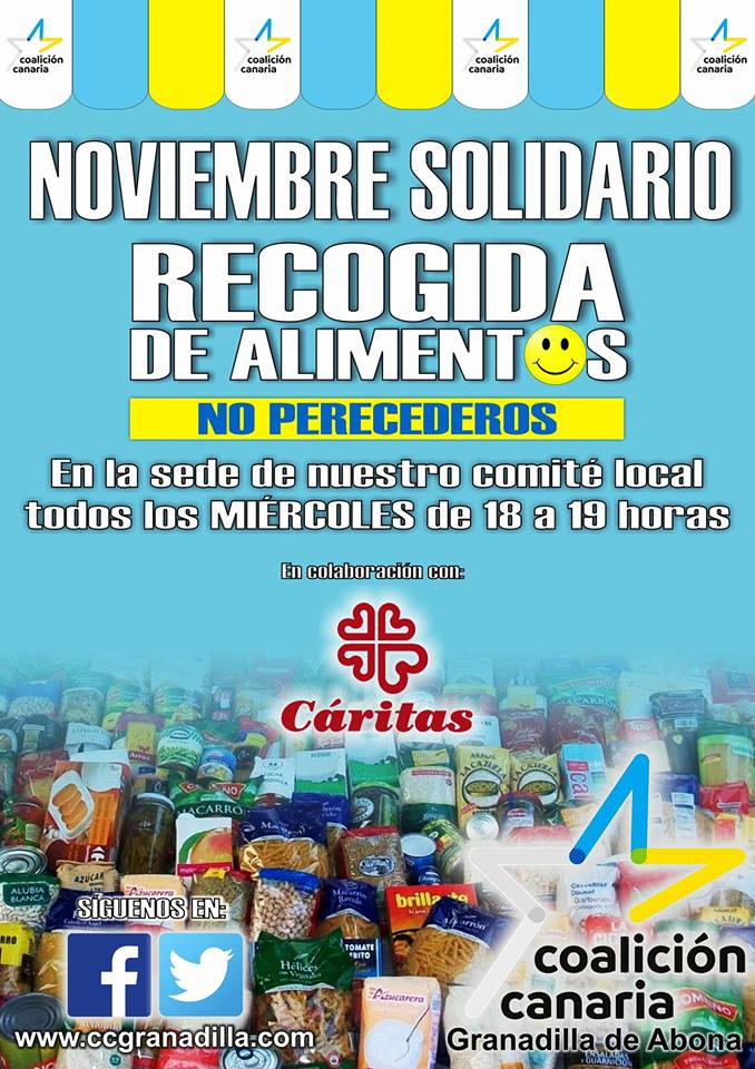 Tras la gran aceptación y participación con la que contaron las cuatro primeras ediciones de ‘Noviembre Solidario’, Coalición Canaria en Granadilla de Abona, junto al comité local de los Jóvenes Nacionalistas de Granadilla de Abona, han decidido continuar con la iniciativa de recogida de alimentos entre los afiliados, simpatizantes y vecinos en general que deseen colaborar con las familias que peor están pasando y poner en marcha la quinta edición de ‘Noviembre Solidario’.