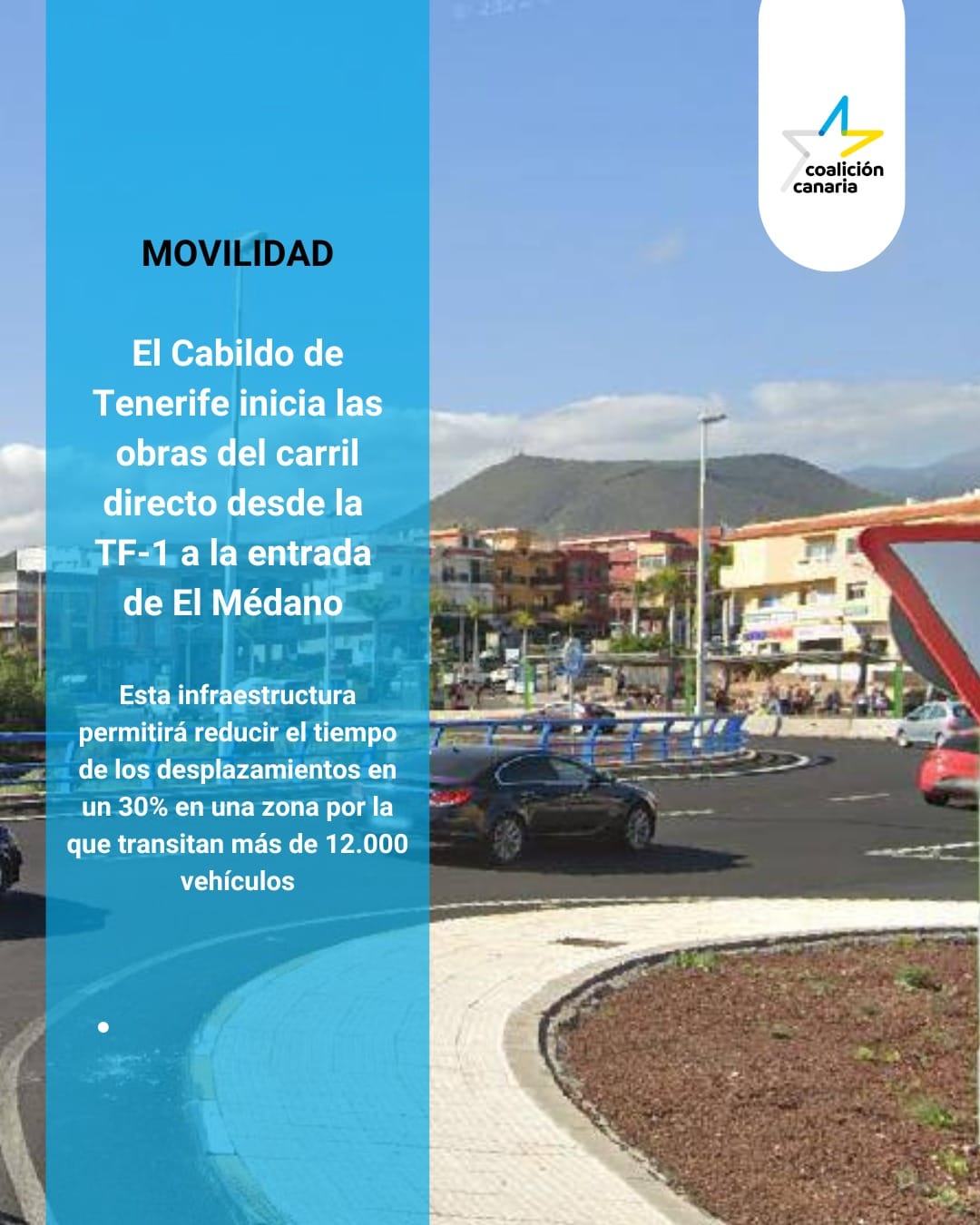 Por otro lado, tal y como anunció el portavoz de 𝗖𝗼𝗮𝗹𝗶𝗰𝗶𝗼́𝗻 𝗖𝗮𝗻𝗮𝗿𝗶𝗮 de Granadilla de Abona, José Domingo Regalado, ya se 𝗶𝗻𝗶𝗰𝗶𝗮𝗿𝗼𝗻 por parte del Cabildo de Tenerife, 𝗹𝗮𝘀 𝗼𝗯𝗿𝗮𝘀 𝗱𝗲𝗹 𝗰𝗮𝗿𝗿𝗶𝗹 𝗱𝗶𝗿𝗲𝗰𝘁𝗼 𝗱𝗲𝘀𝗱𝗲 𝗹𝗮 𝗮𝘂𝘁𝗼𝗽𝗶𝘀𝘁𝗮 𝗮 𝗹𝗮 𝗲𝗻𝘁𝗿𝗮𝗱𝗮 𝗱𝗲 𝗘𝗹 𝗠𝗲́𝗱𝗮𝗻𝗼. Esta infraestructura permitirá reducir el tiempo de los desplazamientos en un 30 % en una zona por la que transitan más de 12.000 vehículos. La empresa Transformaciones y Servicios, S.L. ha sido la adjudicataria del contrato de obras para la ejecución del proyecto que cuenta con una 𝗶𝗻𝘃𝗲𝗿𝘀𝗶𝗼́𝗻 𝗱𝗲 1,1 𝗺𝗶𝗹𝗹𝗼𝗻𝗲𝘀 𝗱𝗲 𝗲𝘂𝗿𝗼𝘀 𝘆 𝘂𝗻 𝗽𝗹𝗮𝘇𝗼 𝗱𝗲 𝗲𝗷𝗲𝗰𝘂𝗰𝗶𝗼́𝗻 𝗱𝗲 10 𝗺𝗲𝘀𝗲𝘀.
