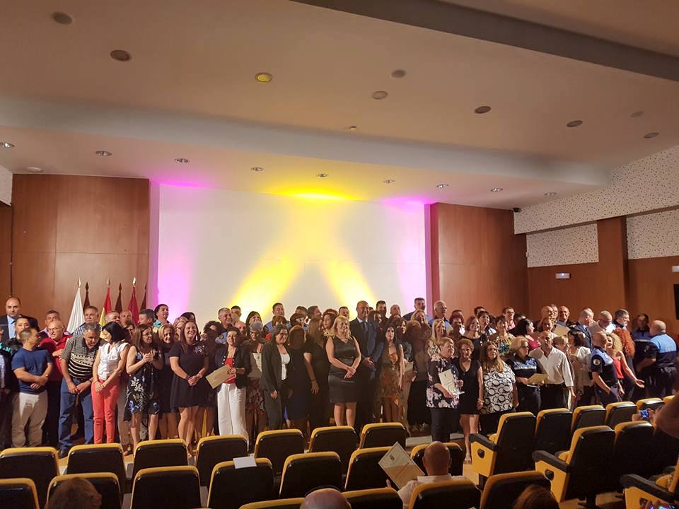 El Ayuntamiento de Granadilla de Abona ha querido reconocer la trayectoria del personal laboral y funcionario de la administración local con más antigüedad. El alcalde, José Domingo Regalado González, y la concejala de Recursos Humanos, María Candelaria Rodríguez González, acompañados del secretario municipal, Gerónimo Cabrera Gálvez, fueron los encargados de dar la bienvenida al acto de entrega de honores y distinciones a más de un centenar de trabajadores. Nuestro alcalde trasladó en su nombre, y el de toda la corporación, las felicitaciones a todo el personal del Consistorio, y en especial a las más de 100 personas que recibieron, en un entrañable acto, sus medallas y granadas de honor por sus 15, 25 y 35 años de antigüedad, tal y como se recoge en el Reglamento de Honores y Distinciones. Concluyó dándole las gracias por su labor desarrollada hasta ahora y en el futuro en pro del mejor servicio a la ciudadanía.